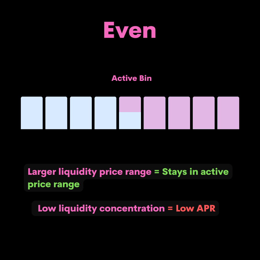 Having liquidity concentrated around the active bins allows users to capture higher trading fees. The more distributed model allows the strategy to capture a larger price range with less chance of being priced out of the active price range.